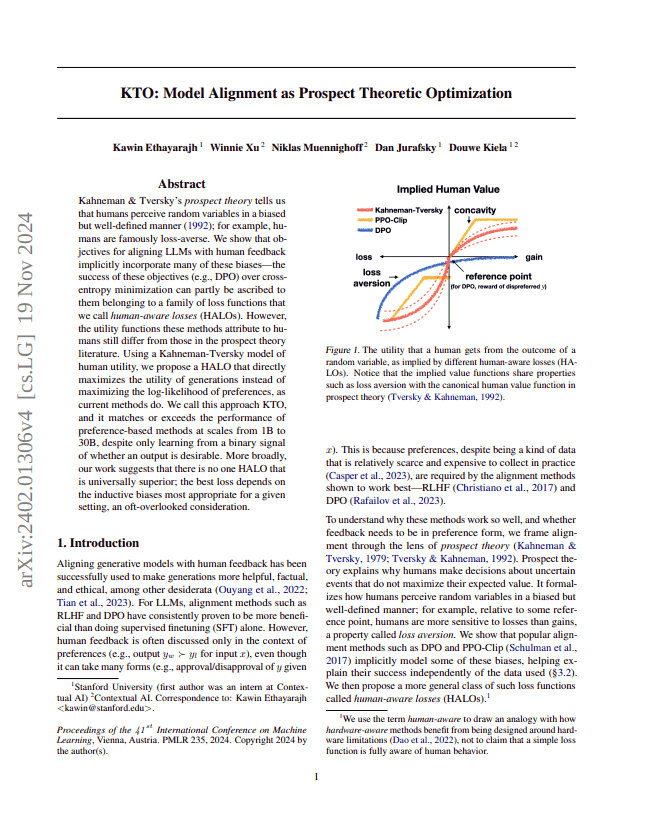 Arxiv: KTO: Model Alignment as Prospect Theoretic Optimization